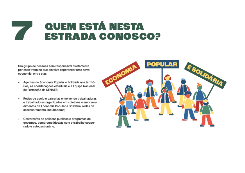 O Guia das Coordenações foi desenvolvido para auxiliar os coordenadores regionais na organização e estratégia de formação dos Agentes de Economia Popular e Solidária (AGEPS). Foram criadas diversas ilustrações para compor o material didático.